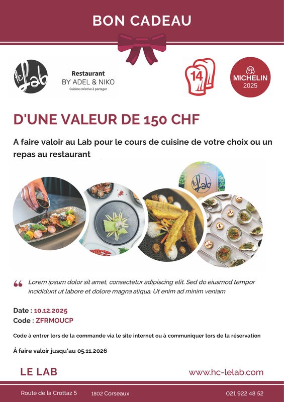 Offrez à vos proches un instant d'exception lors d'un cours de cuisine, de pâtisserie ou en compagnie d'un Chef étoilé ! Nos bons cadeaux peuvent également être utilisés pour tout achat d'article du shop. Le cadeau idéal pour toutes occasions ! Valable 1 année à partir de sa date d'émission. À faire valoir lors de réservation d'un cours ou l'achat d'un article du webshop, directement via le site internet. - Cours pour enfant 60.- / Cours de pâtisserie thématique 120.- / Cours de cuisine thématique 150.- / Cours de pâtisserie avec Chef d'exception 180.- / Cours de cuisine avec Chef d'exception 250.-